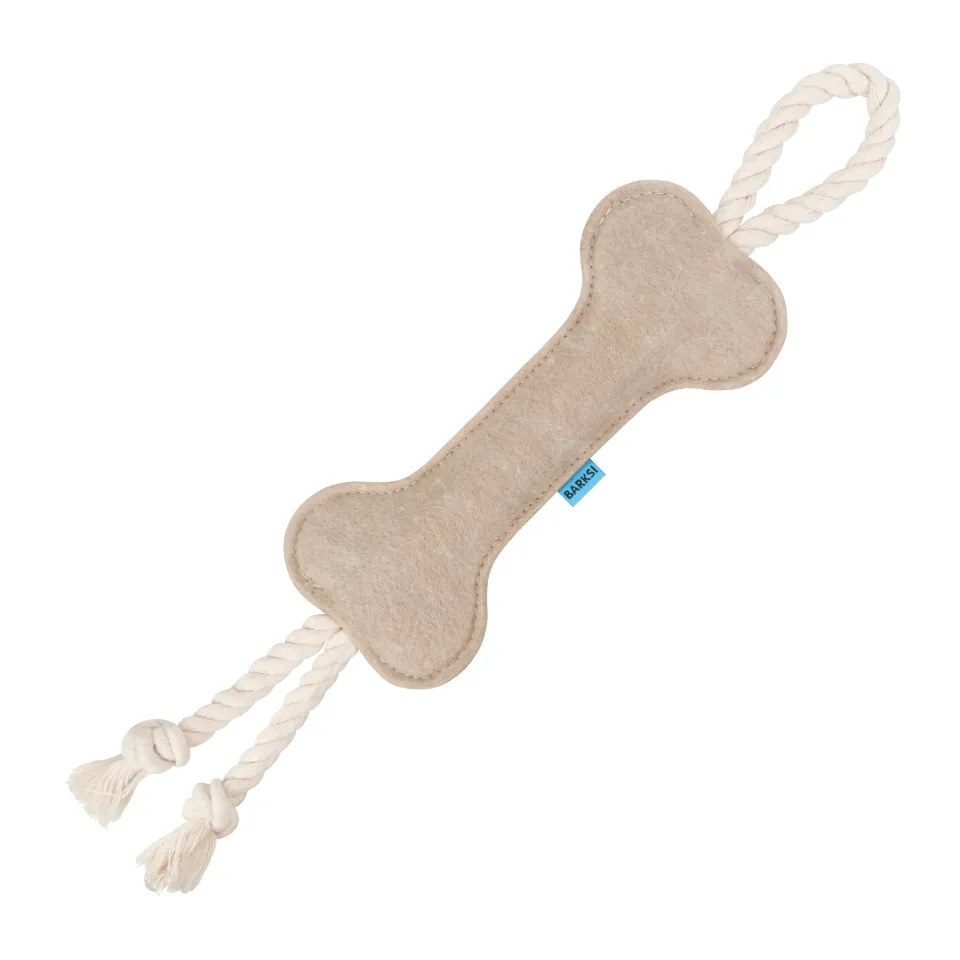 Іграшка для собак Barksi Кісточка з канатом — це м’який, екологічний та безпечний варіант розвиваючої іграшки, яка поєднує натуральну текстуру повсті та функціональність каната. Матеріал м’який на дотик, добре витримує жування, натуральний, не токсичний, гіпоалергенний. Канат добре тримає форму та чудово підходить для перетягування та інших тренувань. Іграшка допомагає масажувати ясна та очищувати зуби, не шумить під час гри вдома, легко кидати, носити з собою на прогулянки. Багато собак вважають такі іграшки улюбленими, бо вони схожі на здобич: можна тріпати, тягти, перемагати! А спільна гра з господарем — це чудовий соціальний досвід.