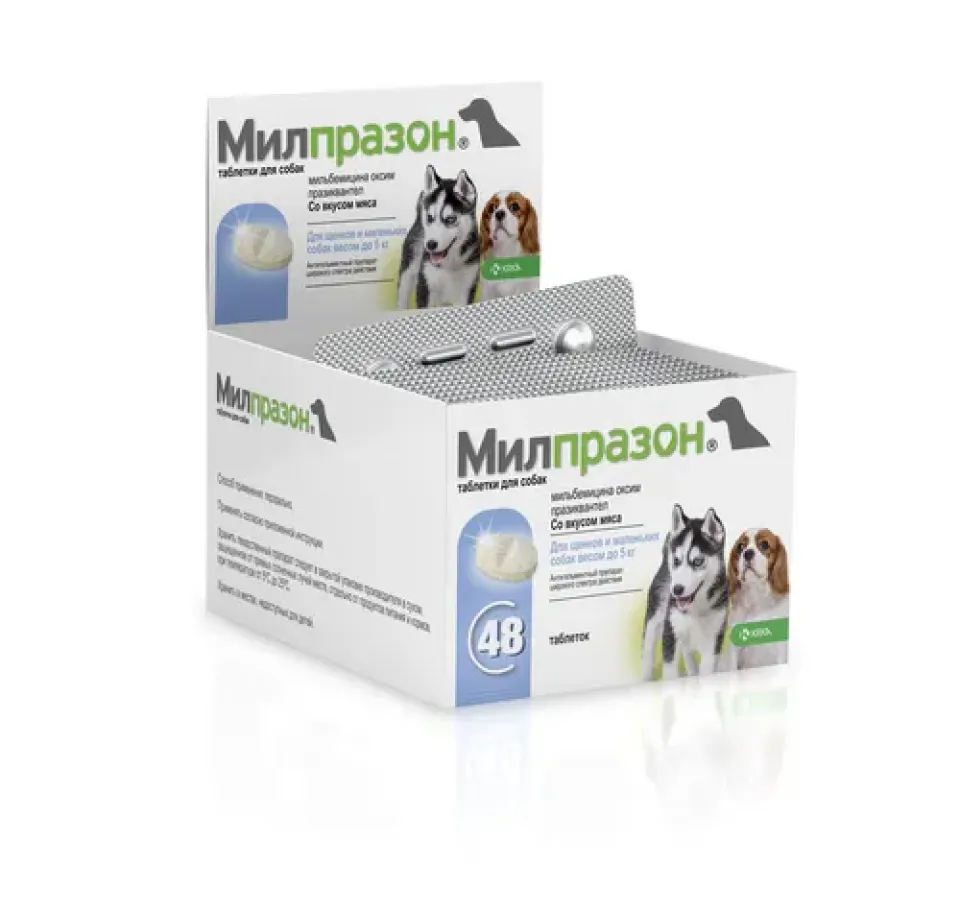 Мілпразон таблетки для маленьких собак та цуценят(Таблетки)ОписТаблетки овальної форми двоопуклі жовтувато-білого кольору з коричневими цятками з рискою на одному боці.Склад1 таблетка містить діючі речовини:мілбеміцину оксим - 2,5 мг,празіквантел - 25 мг.Допоміжні речовини: целюлоза мікрокристалічна, лактози моногідрат, повідон, натрію кроскармелоза, кремній колоїдний безводний, магнію стеарат, ароматизатор м'яса, порошок дріжджів.Фармакологічні властивостіATCvet QP54, ендектоциди (QP54AB51, мілбеміцини)Фармакодинаміка.Мілпразон - комбінований антигельмінтний препарат нематоцидної і цестоцидної дії. Діючі речовини, які входять до складу препарату, обумовлюють його широкий спектр антигельмінтної дії.Мілбеміцину оксим - макроциклічний лактон, отриманий в результаті ферментації Streptomyces hygroscopicus, типу Aureolacrimosus, активний щодо личинок та імаго нематод, які паразитують у травному каналі собак, а також щодо личинок нематод Dirofilaria immitis (мікродирофілярій). Механізм дії мілбеміцину зумовлений підвищенням проникності клітинних мембран для іонів хлору (Сl-), що призводить до поляризації мембран клітин нервової і м'язової тканини, паралічу і загибелі паразита.Празіквантел є похідним ацильованого піразинізохіноліну. Празіквантел активний щодо цестод і трематод. Підвищуючи проникність клітинних мембран паразита для іонів кальцію ( Ca2+), викликає деполяризацію мембран, скорочення мускулатури і руйнування тегументу, що призводить до загибелі паразита і сприяє його виведенню з організму тварин.Фармакокінетика.Після перорального застосування препарату максимальна концентрація мілбеміцину оксиму в плазмі крові собак досягається впродовж 2-4 годин, біодоступність складає біля 80%. З організму тварин виводиться, в основному у незміненому вигляді. Празіквантел, після перорального застосування у собак, після прийому невеликої порції корму, швидко досягає пікового рівня вихідної речовини у плазмі крові (Tmax приблизно 0,25-2,5 години) та швидко знижується (t1/2 приблизно 1 година); сполука швидко і практично повністю біотрансформується в печінці, рівень зв’язування у плазмі складає біля 80%, виводиться з організму впродовж 2-х діб з сечею.У щурів метаболізм є повним, проте повільним, оскільки мілбеміцину оксим у незміненому вигляді не виявляли у сечі або фекаліях. Основними метаболітами у щурів є моногідроксильовані похідні, пов’язані з печінковою біотрансформацією. Крім відносно високих концентрацій у печінці, існує деякий рівень концентрації у жировій тканині, що вказує на ліпофільність речовини.Мілпразон за ступенем дії на організм належить до малотоксичних речовин (4 клас безпечності), у рекомендованих дозах не виявляє сенсибілізуючої, ембріотоксичної і тератогенної дії, добре переноситься собаками різних порід і віку. Препарат токсичний для бджіл, а також для риби та інших гідробіонтів.ЗастосуванняПрофілактика та лікування собак при інвазіях, спричинених цестодами - Dipylidium caninum, Taenia spp., Echinococcus spp., Mesocestoides spp.; нематодами - Ancylostoma caninum, Toxocara canis, Toxascaris leonina, Trichuris vulpis, Thelazia callipaeda; Angiostrongylus vasorum (знижує інтенсивність зараження), Crenosoma vulpis (знижує інтенсивність зараження), Dirofilaria immitis (профілактика захворювання); в т.ч. при комбінованих нематодо-цестодозних інвазіях.Препарат також можна застосовувати для профілактики дирофіляріозу серця (Dirofilaria immitis), якщо пок