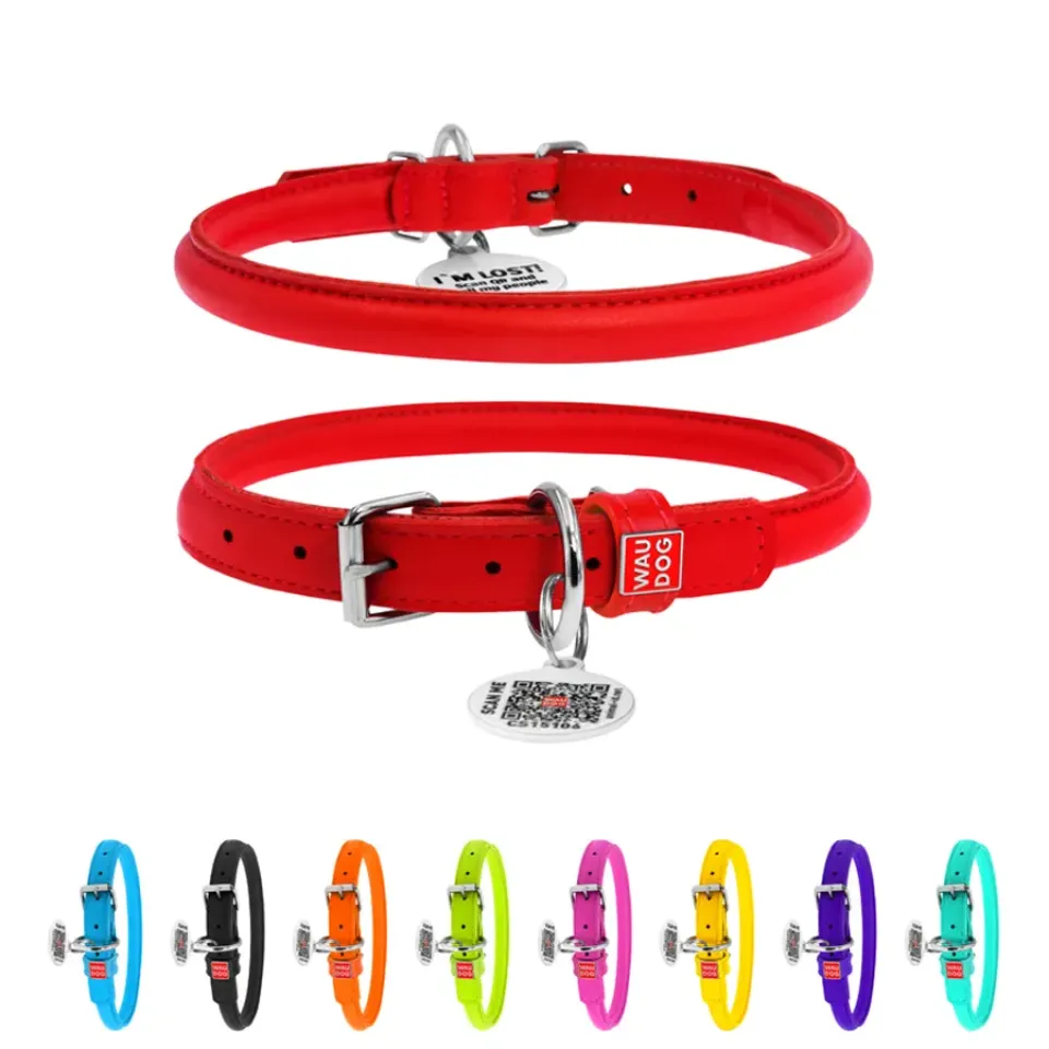 Нашийник для собак шкіряний WAUDOG Glamour з QR паспортом, круглий, Д 10 мм, Дов 33-41 см червоний
