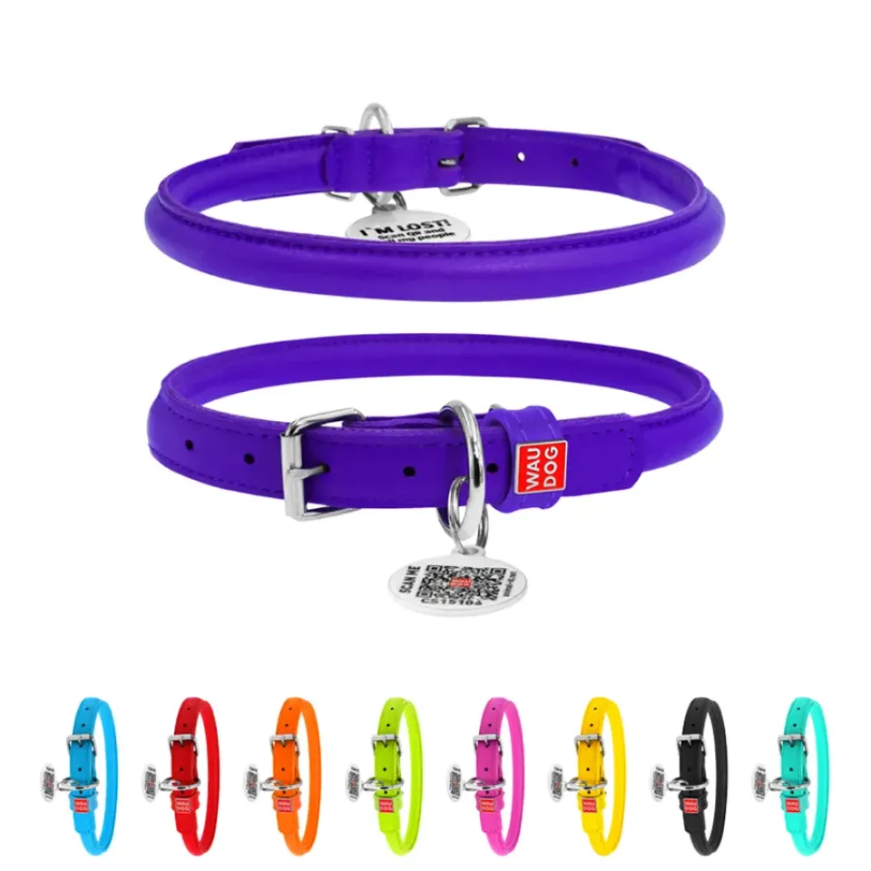 Нашийник для собак шкіряний WAUDOG Glamour з QR паспортом, круглий, Д 10 мм, Дов 33-41 см фіолетовий