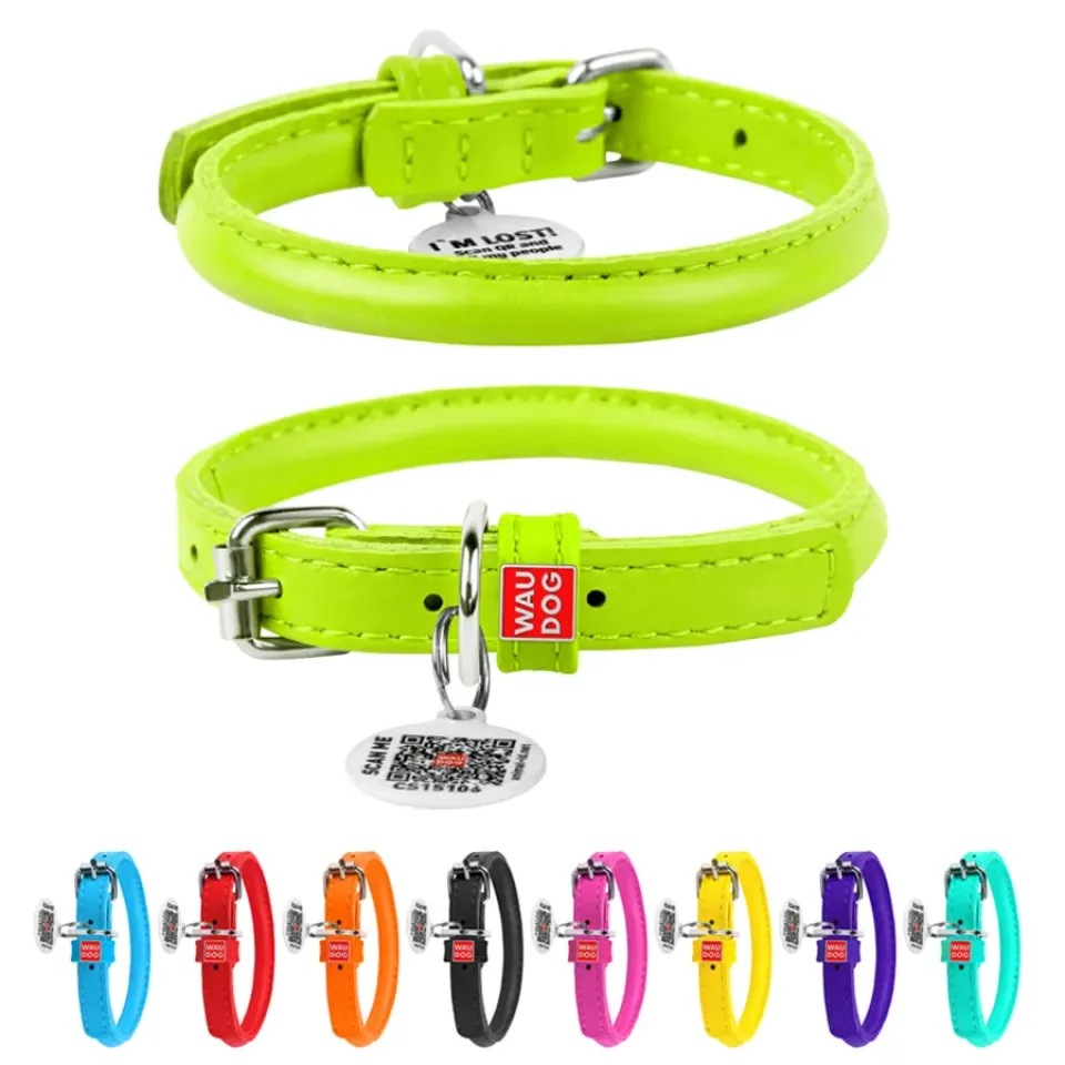 Нашийник для собак шкіряний WAUDOG Glamour з QR паспортом, круглий, Д 8 мм, Дов 20-25 см салатовий