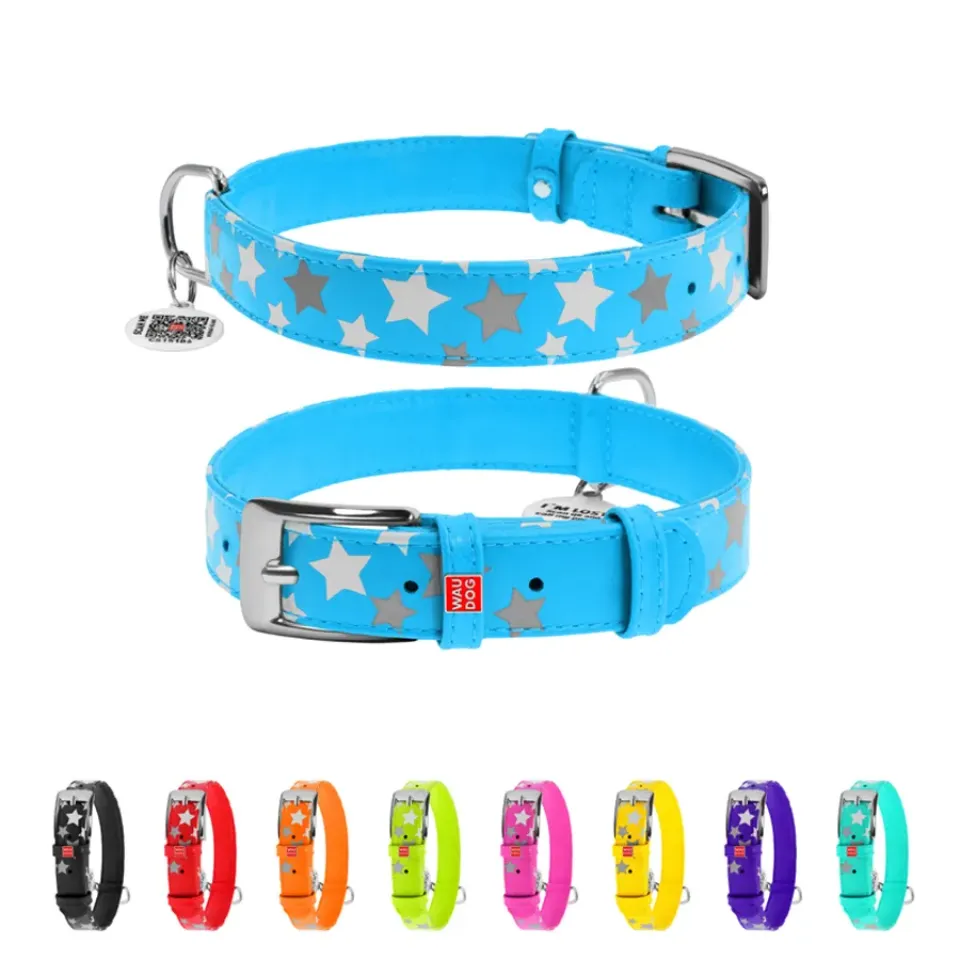 Нашийник для собак шкіряний WAUDOG Glamour з QR паспортом, візерунок "Зірочка", світонакоплювальний, Ш 20 мм, Дов 30-39 см блакитний