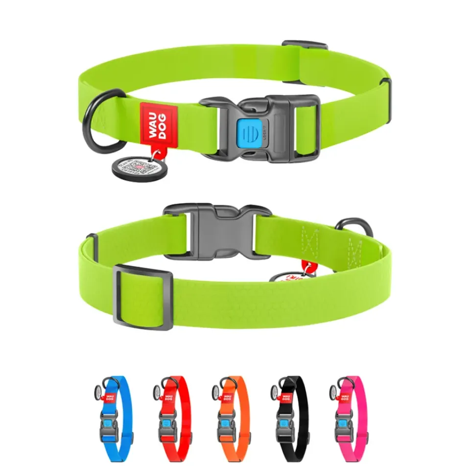 Нашийники WAUDOG Waterproof виготовлені з інноваційного комбінованого матеріалу, розробленого Компанією COLLAR. Він складається зі внутрішнього армуючого шару, що несена собі основне навантаження, і зовнішньої прогумованої оболонки з унікальною приємною на дотик фактурою, що перешкоджає ковзанню. Незважаючи на безпрецедентну міцність, матеріал дуже легкий, що дозволяє значно знизити вагу амуніції та зробити її зручнішою у використанні.
