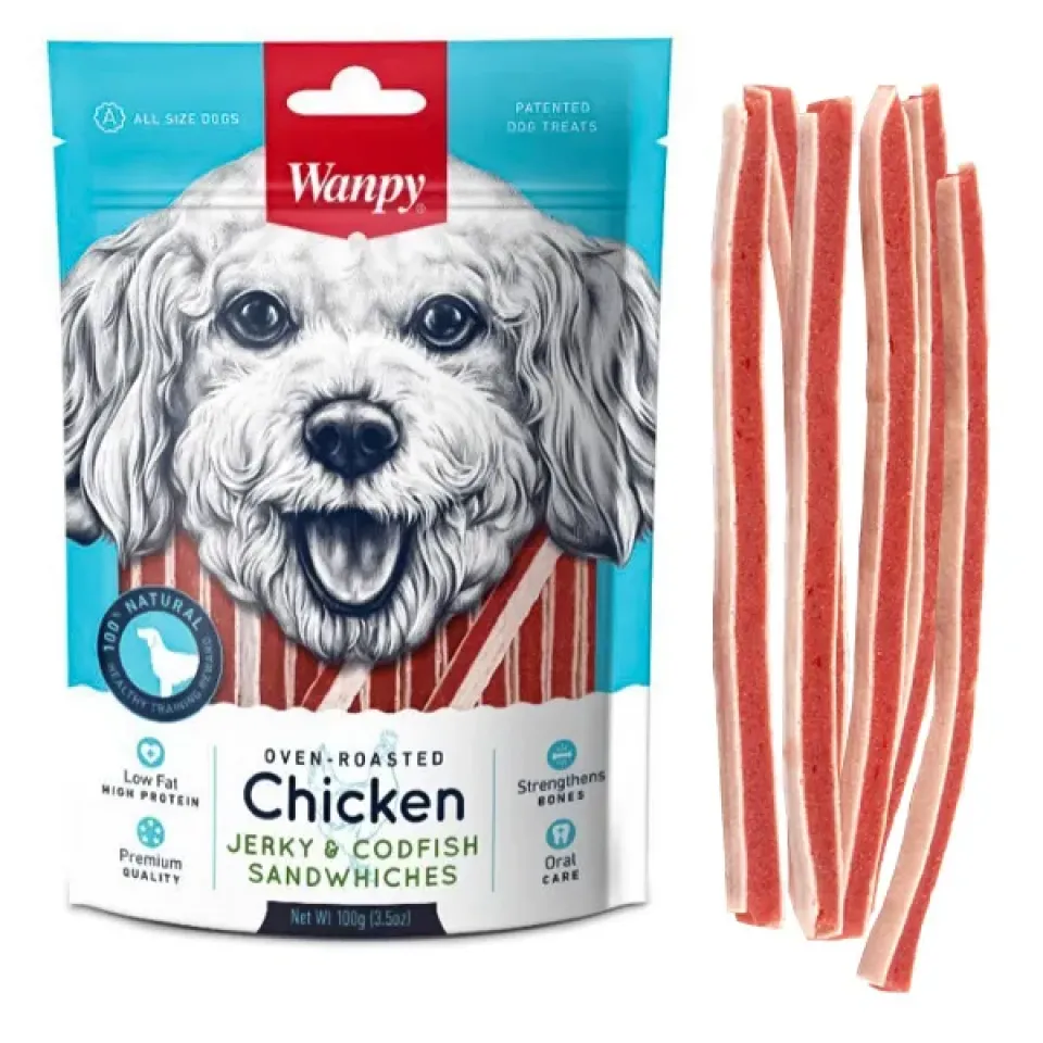 Сендвіч-смужки Wanpy Chicken Jerky & Codfish Sandwiches – натуральні ласощі для собак на основі в’яленого м’яса курки та філе тріски. Призначені як смачне та корисне доповнення до основного раціону собак та цуценят всіх порід від 3-х місяців.Ласощі можна використовувати для різних цілей. Наприклад, як частування або заохочення за хорошу поведінку. Ваш вихованець, як і ви, час від часу любить перекусити і не відмовиться від чогось особливого, що відрізняється від повсякденного корму. З Wanpy Chicken Jerky & Codfish Sandwiches ви пропонуєте улюбленцю м’ясний делікатес преміум-якості без штучних ароматизаторів з пікантною добавкою корисної риби, невеликим акцентом спецій і сіллю як натуральним консервантом. Ласощі запікаються в духовці, щоб зберегти максимум корисних речовин, ніби ви готували ласощі для собак власноруч.Сендвіч-смужки з в’яленого курячого м’яса та тріски також підходять як ласощі для дресирування або тренування собак. Їх легко розламати на частини та пригощати вихованця за вдало виконану команду або вправу. Крім того, натуральні ласощі для собак Wanpy Chicken Jerky & Codfish Sandwiches містять багато корисного тваринного білка та мало жиру. Так забезпечується активність вашого вихованця, зміцнюється його здоров’я та імунітет за належним контролем ваги.Чому варто купити ласощі для собак Wanpy Сендвіч Курка З Тріскою:100% натуральні;преміум якість;допомагають збалансувати раціон собаки;з високим вмістом корисного тваринного білка (філе курки та тріски) для підтримання здоров’я та активності вашого вихованця, зміцнення імунітету;зміцнює кістки та зуби завдяки кальцію та фосфору;контроль ваги: мають низький вміст жиру (1%);здорове травлення: добре перетравлюються, легко засвоюються;тріска – джерело якісного легкозасвоюваного низькокалорійного білка, містить багато вітамінів, мінералів (фосфор, необхідний для мозкової діяльності, калій для здоров’я серцево-судинної системи, кальцій та фтор для здоров’я кісток та зубів та інші) та ненасичених жирних кислот Омега для здорової шкіри, блискучої шерсті та міцного імунітету;мають апетитний смак натурального в’яленого курячого м’яса з пікантною добавкою корисної риби та невеликим акцентом спецій;запікаються в духовці: завдяки щадному процесу обробки філе курки та тріски зберігає всі корисні властивості та поживну цінність;можна використовувати як мотивувальний фактор під час дресирування або за хорошу поведінку;не містять штучних ароматизаторів;зручно зберігати: опаковання із замком Zір-Lосk зберігає свіжість ласощів.Розміри ласощів (ДхШ): ±12х0,7 см.Країна-виробник: Китай. ІНГРЕДІЄНТИ: м’ясо курки, гліцерин, тріска, рослинний білок, крохмаль, часниковий порошок, дозволені в ЄС та Україні харчові барвники (E172), сіль, цукор, рослинна олія. АНАЛІЗ СКЛАДУ: протеїн – 28%, жир – 1%, клітковина – 0,5%, зола – 3%, вологість – 30%. ІНСТРУКЦІЯ: РЕКОМЕНДАЦІЇ ЩОДО ГОДУВАННЯ: як перекус між прийманнями їжі для собак і цуценят від 3-х місяців. Завжди забезпечуйте достатній запас свіжої питної води для собаки.УВАГА! Абсорбент, що знаходиться всередині пакунку, не підлягає згодовуванню вихованцеві, він необхідний тільки для запобігання утворенню вологи всередині пакунку. НОРМИ ГОДУВАННЯ:– для собак вагою 5-10 кг – 10-20 г;– для собак вагою 10-25 кг – 20-40 г;– для собак вагою понад 25 кг – 40-60 г.ЗБЕРІГАННЯЗберігати у сухому прохолодному місці 