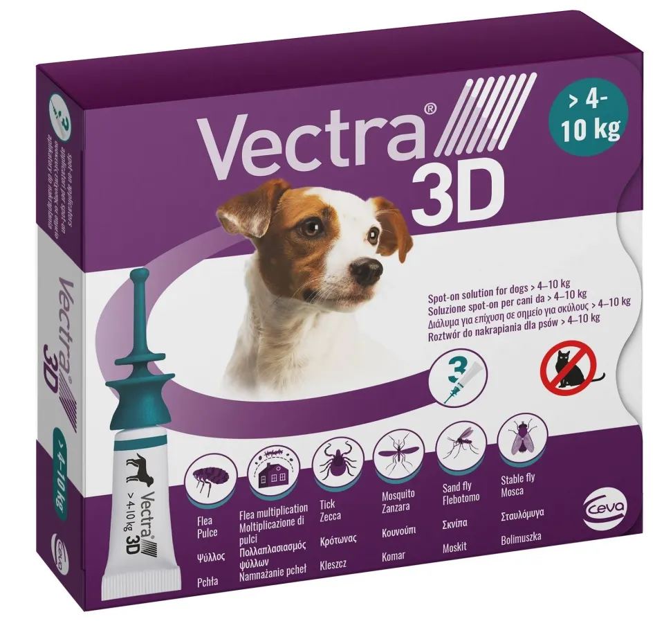 Вектра 3D – має найширший спектр дії порівняно з присутніми на ринку засобами на сьогодні (доведено клінічними випробуваннями) та найзручнішу піпетку (запатентований аплікатор, що дозволяє швидко й просто обробити будь-якого собаку).