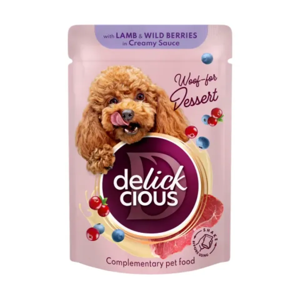 Апетитні пластівці з ягнятиною і ягодами, а також вершковий соус, що дарують багатий смак і делікатну кремову текстуру. Цей рецепт поєднав відбірні натуральні інгредієнти з добавкою вітамінів і мінералів не просто для насолоди, а підвищення якості життя собаки, аби підтримувати її красу і добре самопочуття. Підходить як додаток до повсякденного харчування, аби балувати улюбленця і наповнювати його будні задоволенням. Делизькатес Delickcious. Не просто їжа, а вау-лизь!