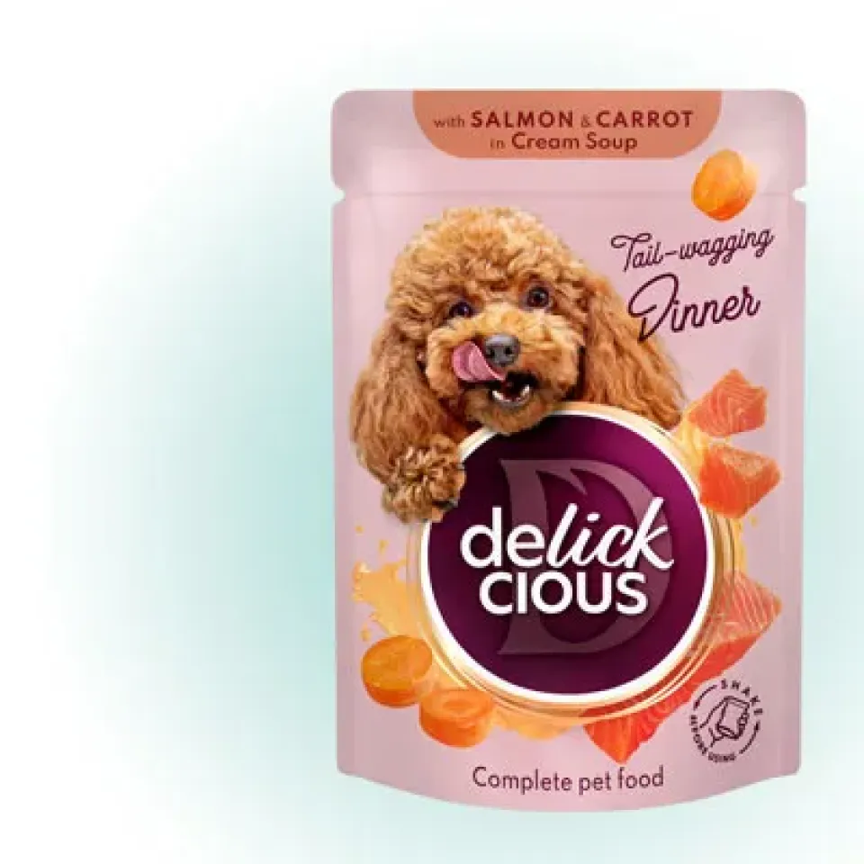 Смужки з відбірного лосося, огорнуті ніжним крем-супом, слугують джерелом легкозасвоюваного білка і дають щоденний заряд енергії.Досконалий рецепт не просто враховує потреби організму тварини, а дозволяє насичуватися з задоволенням. Багатство смаку і баланс поживних речовин — все, аби балувати улюбленця якісною їжею. Ваш пес заслуговує на делікатес. Делизькатес Delickcious. Не просто їжа, а вау-лизь!Переваги: